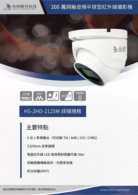 200萬畫素同軸音頻半球型紅外線攝影機(HS-2HD-2125M)