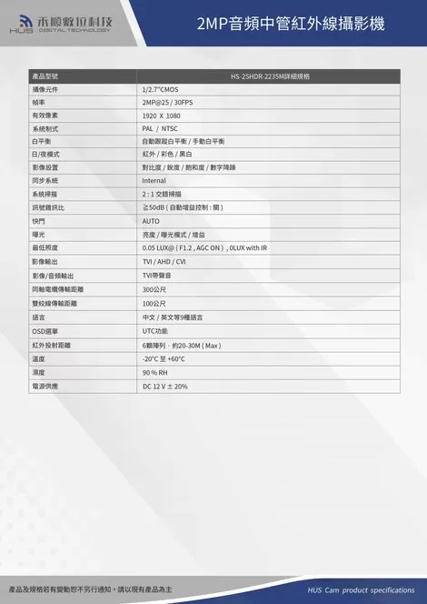 1/2.7”CMOS 2百萬像素晶片支援AHD/TVI/CVI同軸高清輸出支援麥克風跟聲音同軸輸出(支持TVI模式)UTC功能內建IR CUT濾光鏡片,日夜同焦更精確同一線纜多工傳輸影像及聲音支援數字降噪 ,2D-DNR