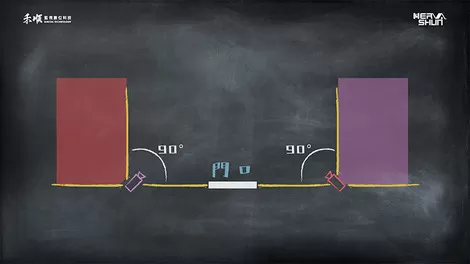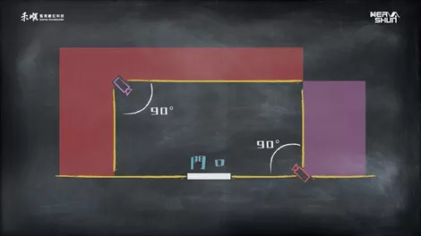 一般監視攝影機的最大可視角度為90度,如果今天把門口前方的180度視為我們需要拍攝到的範圍,就變成簡單的數學問題,需要安裝兩支90度的監視器才可以補足180度的範圍;而監視器安裝的規劃通常會分成以下兩種: