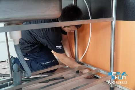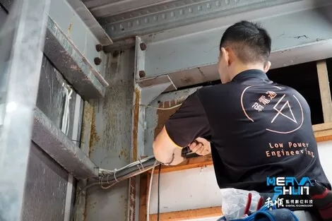 打開天花板後,工程師先憋氣三十秒,準備拉線
