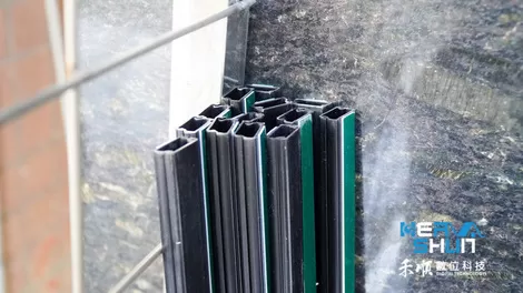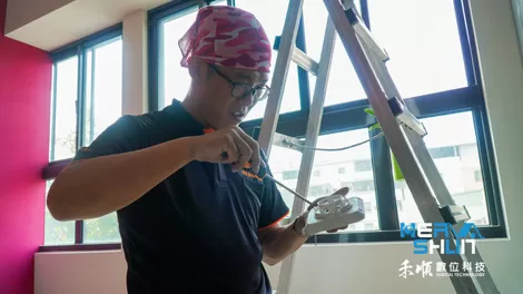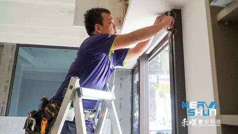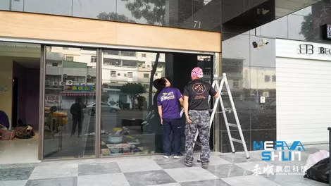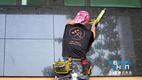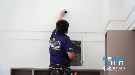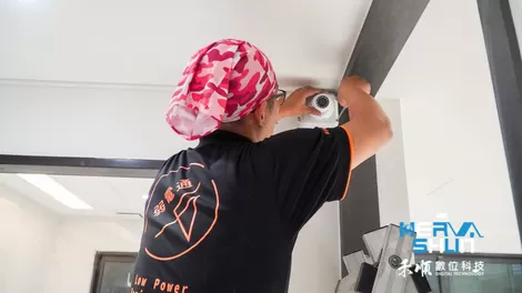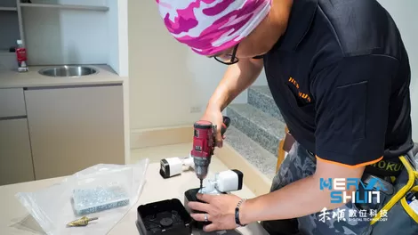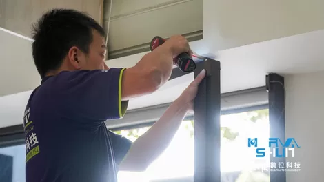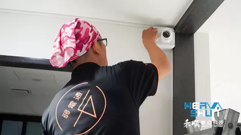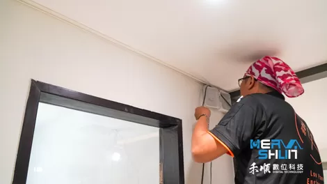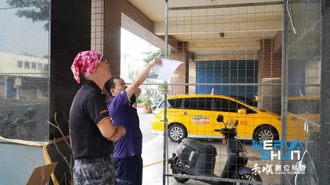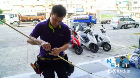 再來要貼上去監視器防水盒時,工程師會先測量高度、大概壓條的位置